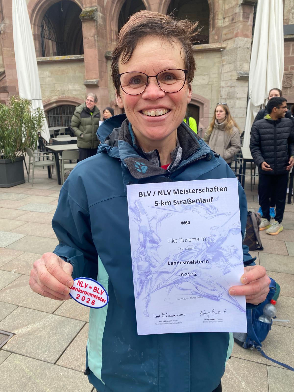 Die niedersächsischen Landesmeisterschaften im 5 km Straßenlauf am vergangenen Sonntag hätte für Elke Bussmann nicht erfolgreicher verlaufen können. Bei kühlem, aber gutem Laufwetter sicherte sie sich souverän den Titel der Landesmeisterin in der Altersklasse W60.